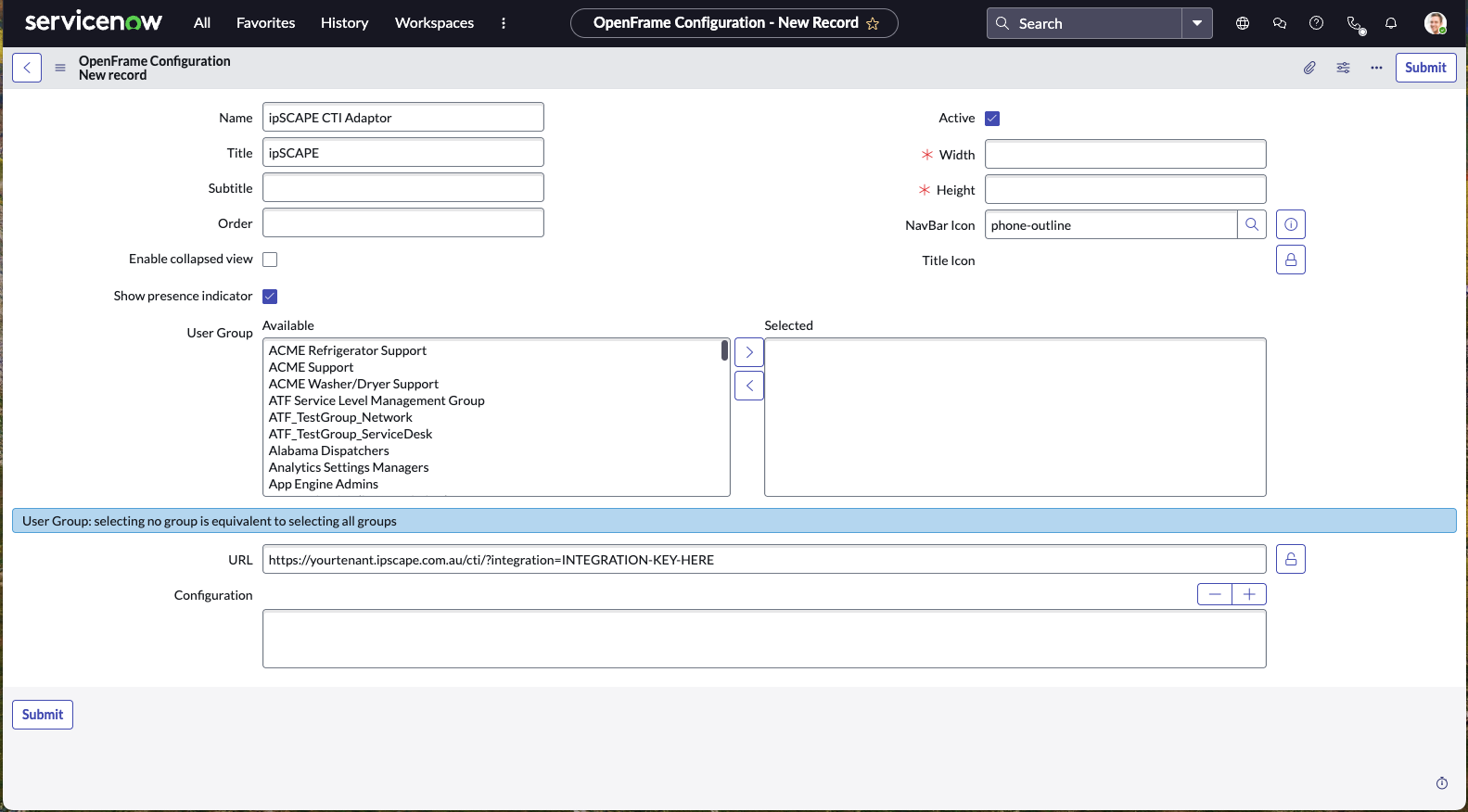 IPscape supports ServiceNow integration. Once configured you will see a 'softphone' within ServiceNow from which you can make and receive calls.