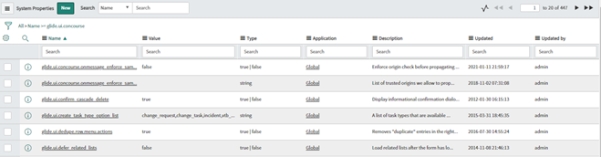 The entire list of properties in the System Properties table should appear.Verify that glide.ui.concourse.onmessage_enforce_same_origin is set to “true”