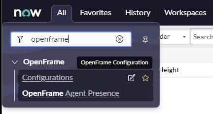 Find the Openframe plugin by entering its name in the All search box from the toolbar and select Openframe > Configurations.