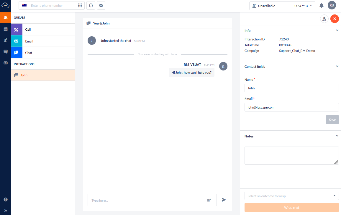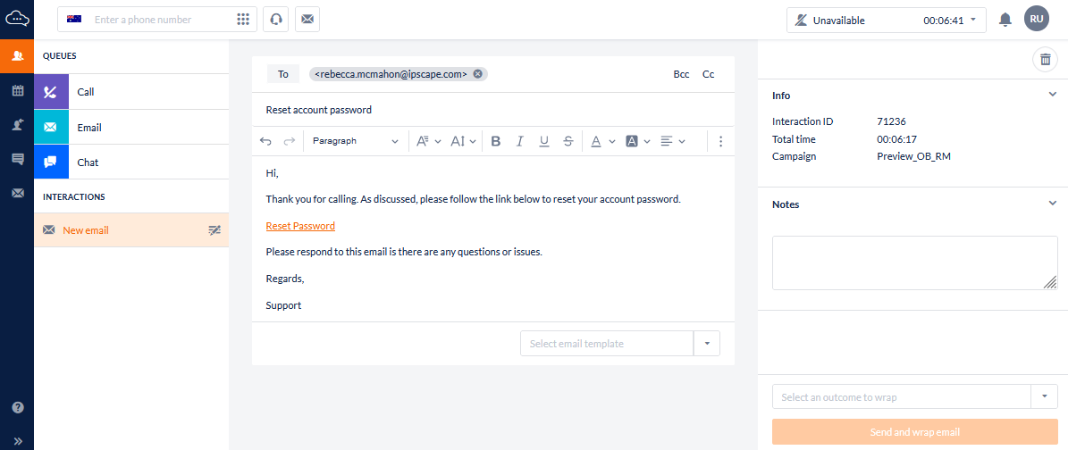 If you are ready for voice interaction, ensure the agent status is Available, click on Send & wrap email.