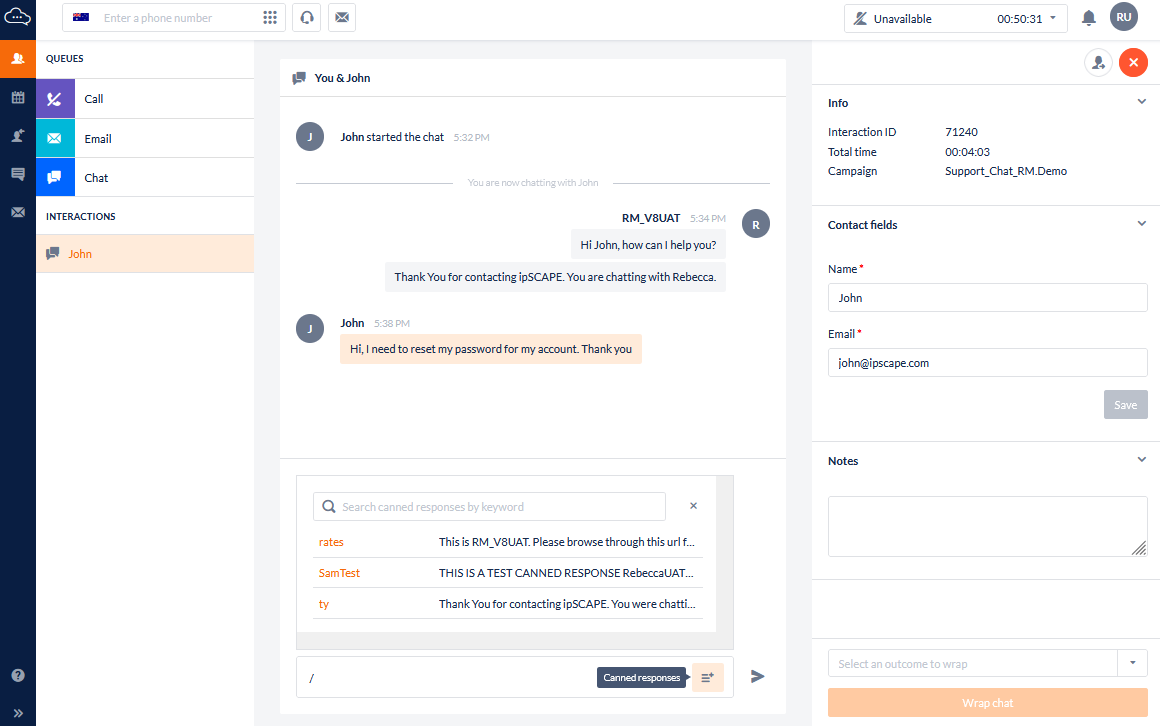 Chat canned response (previously known as Chat Templates) are examples of preconfigured text that an agent will need to use regularly and therefore should not have to repeatedly type.