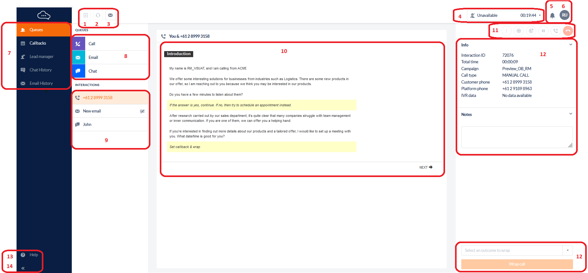 Information about the call and lead will appear on the right-hand side of the Agent Toolbar including a section for including notes to be stored with the call.