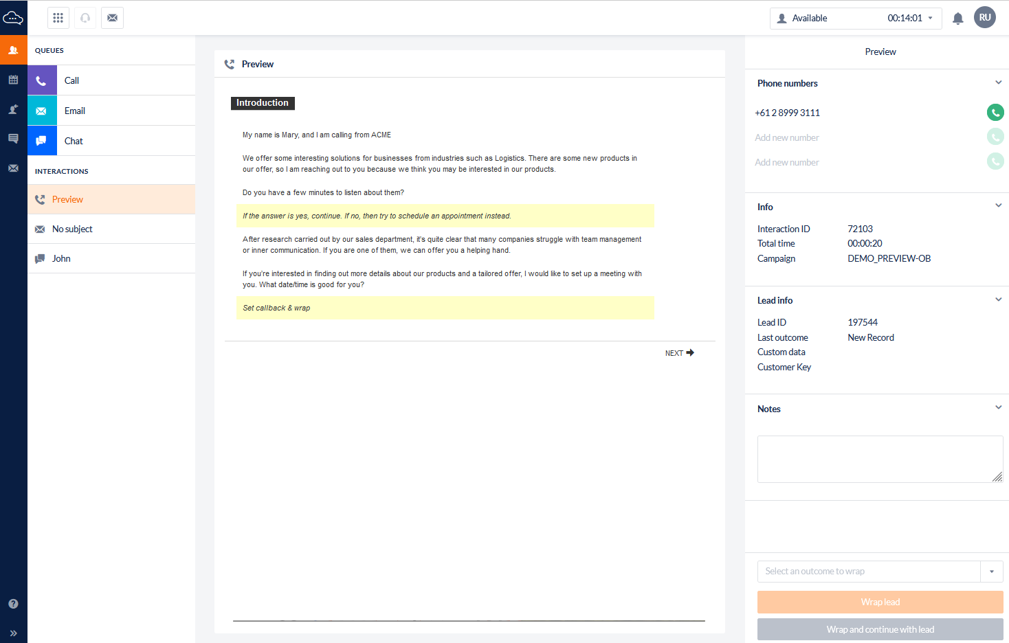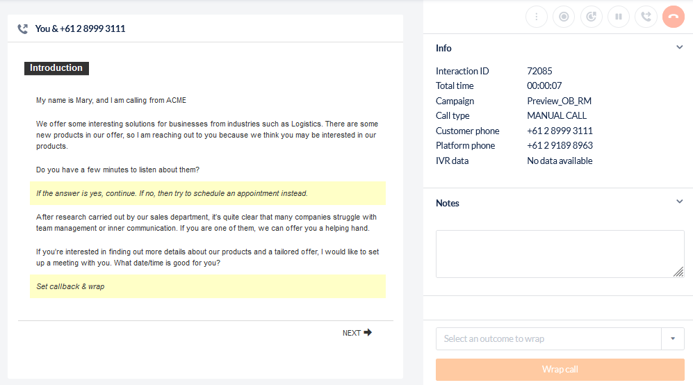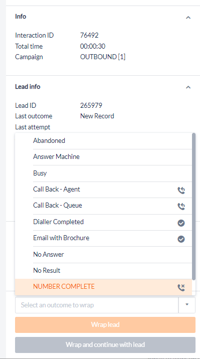 Select an Outcome from the dropdown at the bottom of the information section and click Wrap Call