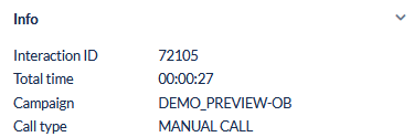 Total Time | Shows a timer (hh:mm:ss) of the total sum of call time for the interaction. |