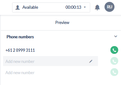 If this feature is enabled by your administrator, when the Preview lead is presented on the Agent Toolbar the agent will have the ability to edit or add to the lead phone numbers if required.