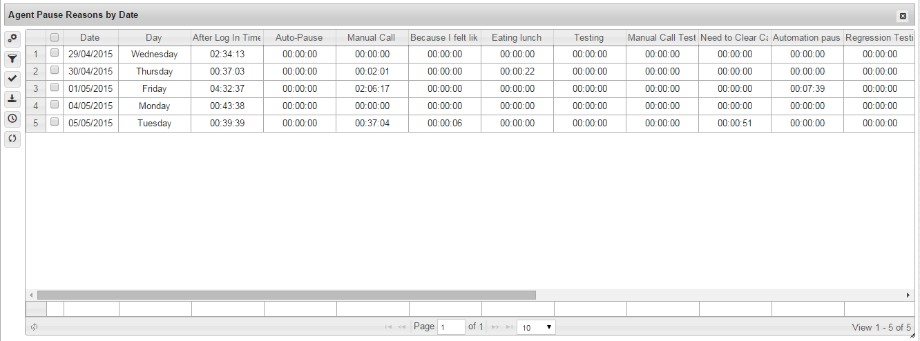 This report summarises the duration spent paused on each day for each reason available to the agents involved.