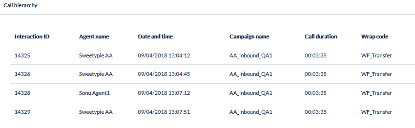 Call Hierarchy | If the call was involved in a transfer between agents or workflows within ipSCAPE, any related interactions will be displayed in order. See Call Hierarchy for more information. |