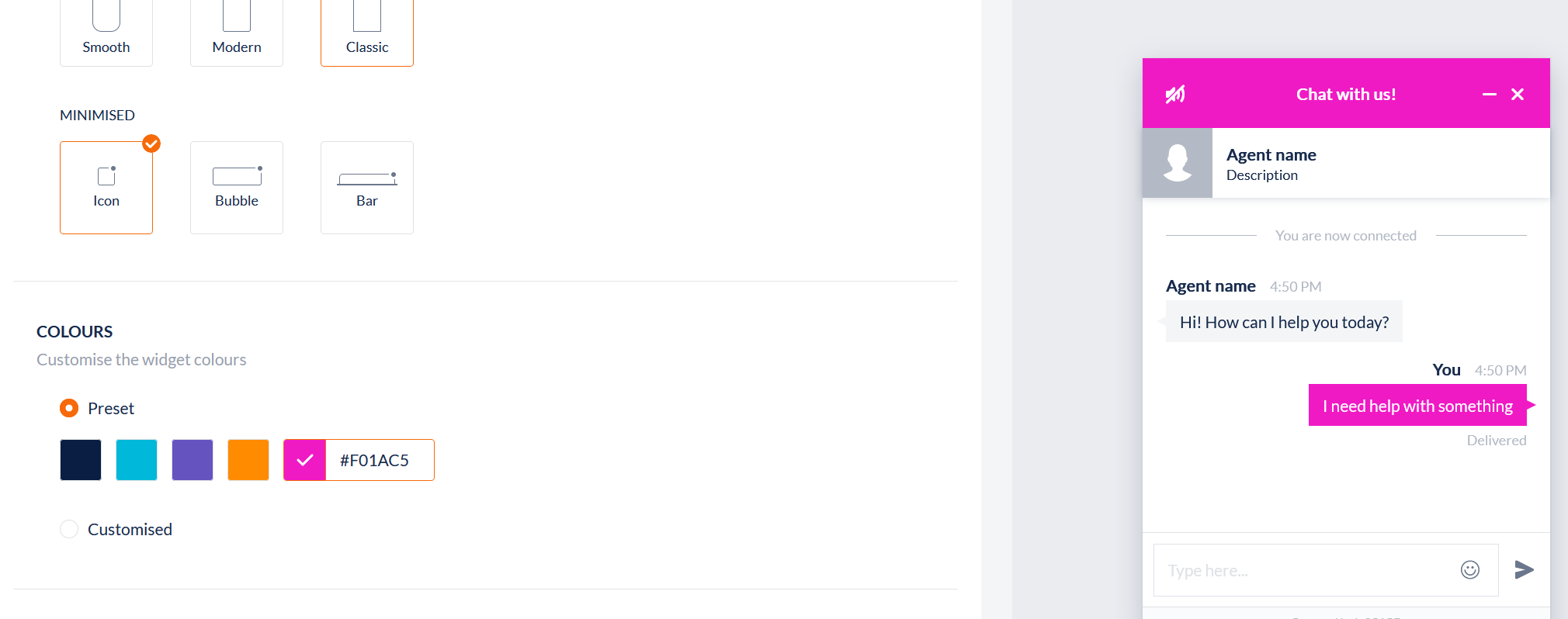 Options are available to customise the colours of the chat widget to match your website and/or organisation branding. The user has the option to select a Pre-set colour theme, or can created a Customised colour theme: