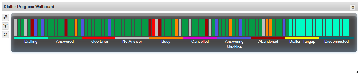 This is a proprietary report that presents a visual representation of the current or final status of the most recent 100 dial attempts made. The rightmost bar represents the status of the most recent dial attempt.