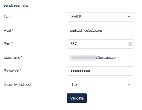 Select the Type of email protocol for sending emails, enter the email server settings and click Validate.