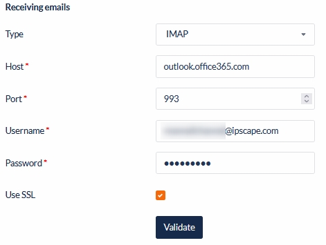 Select the Type of email protocol for receiving emails, enter the email server settings and click Validate.