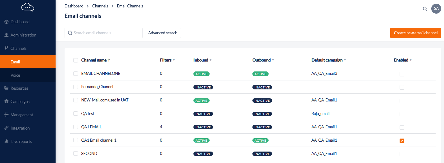 Enabled | A checkbox to enable or disable an email channel |