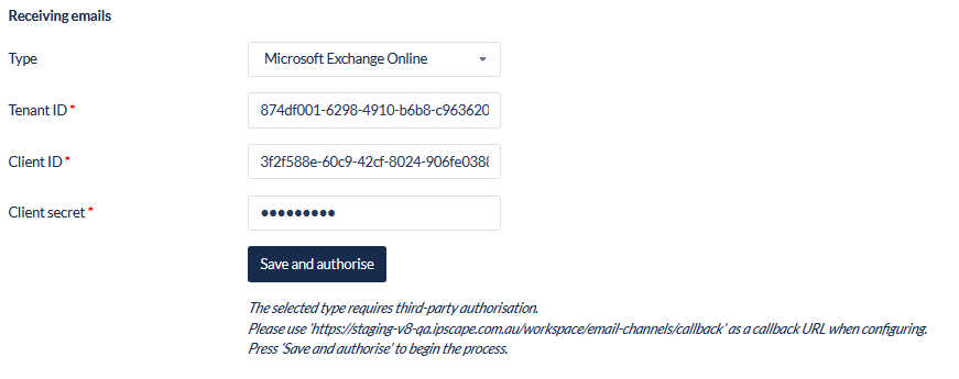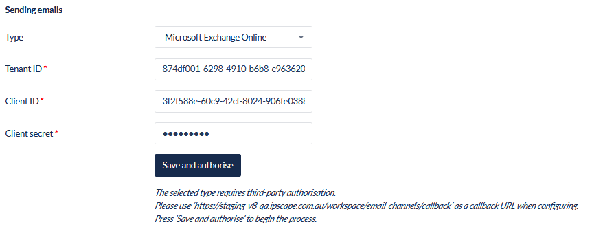 More information on the callback URL for Azure administrators can be found here: https://knowledgehub.ipscape.com/Workspace/Microsoft-Exchange-Online---Azure-configuration.1668317214.html