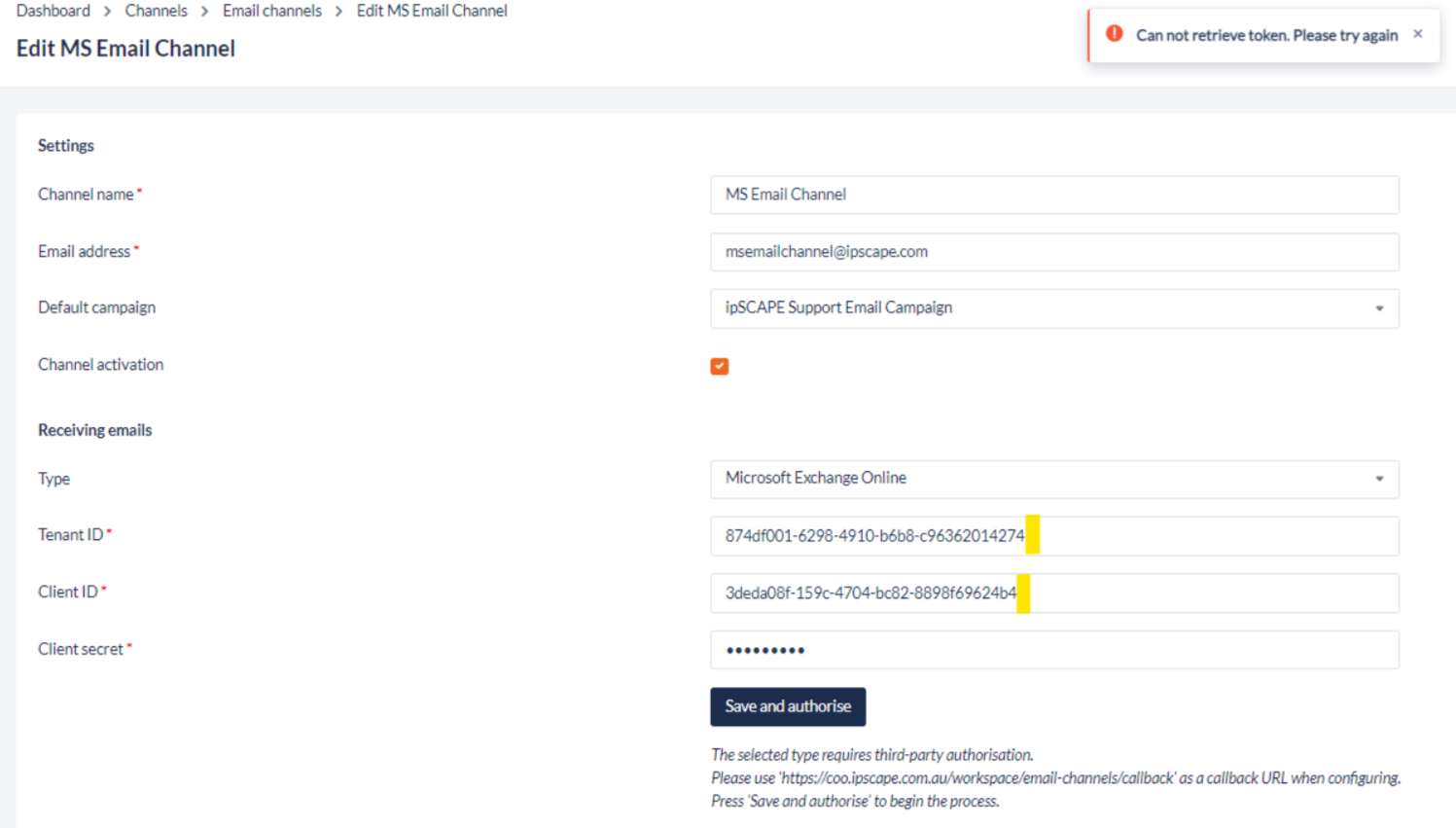 First the configuration of the Microsoft Exchange account should be completed in Azure before setting up and validating the channel: https://knowledgehub.ipscape.com/Workspace/Microsoft-Exchange-Online---Azure-configuration.1668317214.html