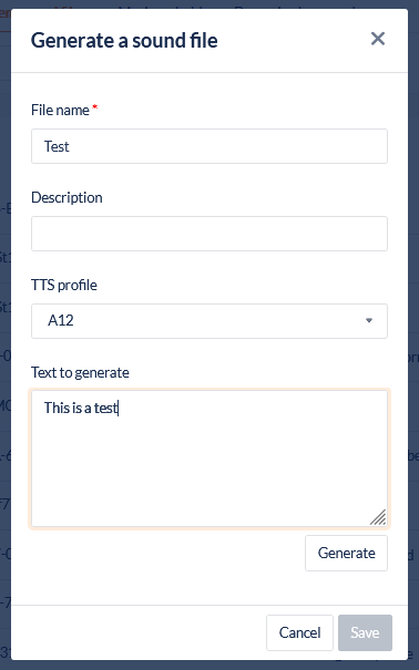 • To generate a new sound file using Text-to-Speech (TTS), click the Generate a sound file button in the header to open the Generate a sound file dialog. Please note you will need to create a default TTS profile first - to create a default TTS profile visit Text-to-Speech (TTS).