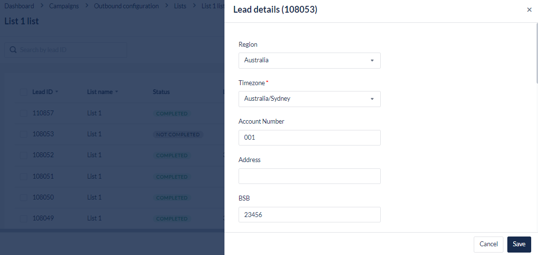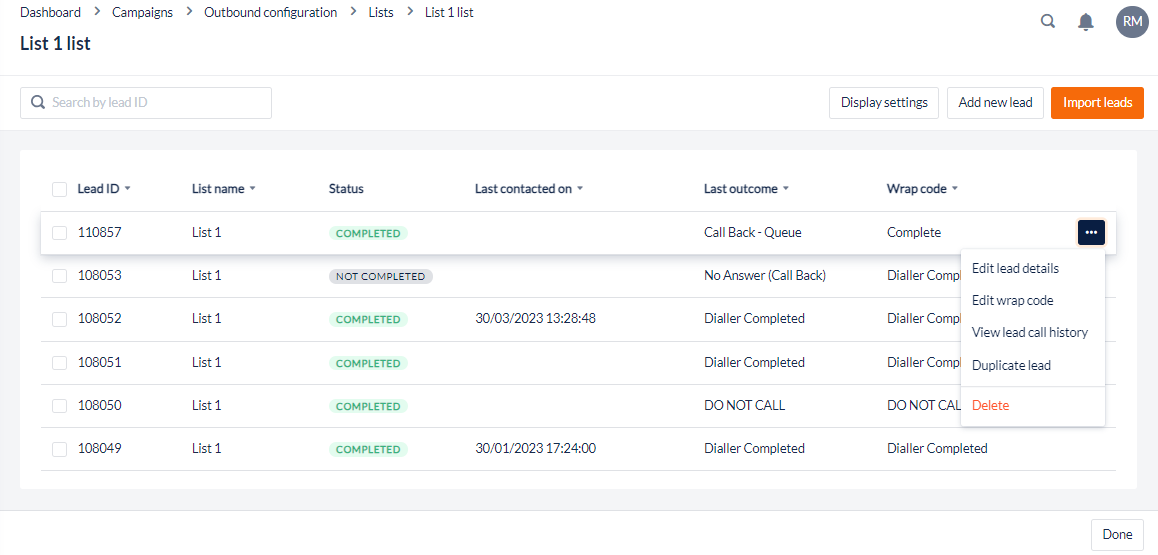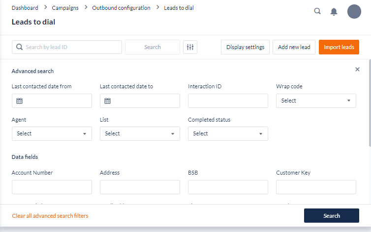 The Leads module allows a user to search, import, manage, display, and filter leads. Leads are individuals who the contact centre will attempt to contact during an Outbound Campaign. A campaign can contain multiple lists of Leads which can be weighted with a dial ratio. After an interaction, these are referred to as a Contact.