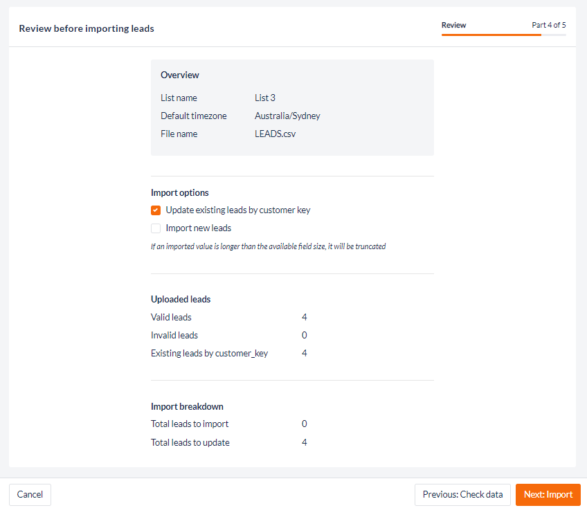Check Import new leads when updating an existing lead list with new data or records, or Update existing leads by Customer Key will be available if importing to a List populated with Leads and want the imported data for existing leads (matched by Customer_key) to overwrite existing data for those leads. If not selected, then this information will be stored in a separate record in the database, which may result in duplicate leads.Uploaded Leads: