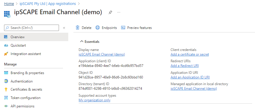 When registration finishes, the Azure portal displays the ipSCAPE app registration's Overview pane showing the Application (client) ID and Directory (tenant) ID which are required to configure the email channel in the ipSCAPE workspace.