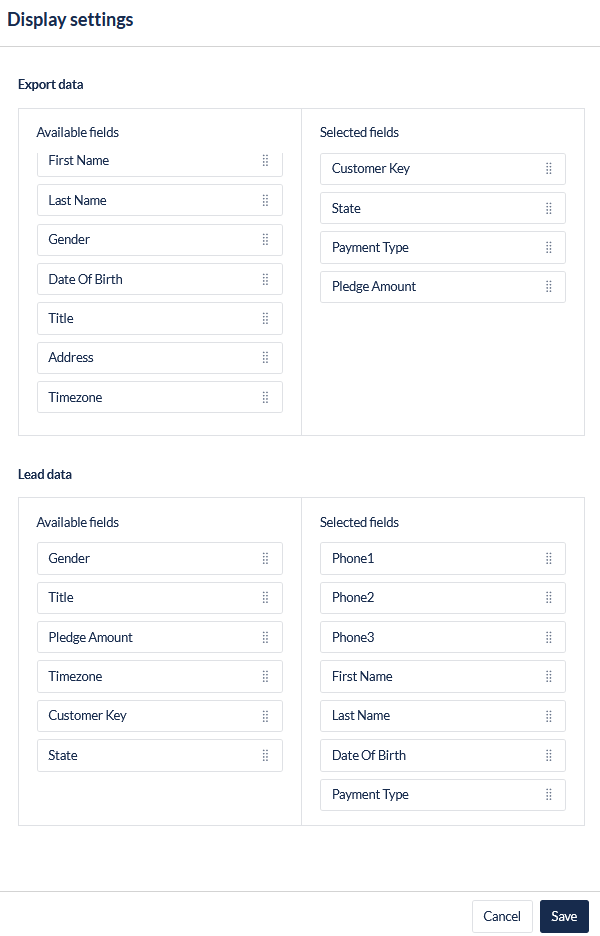 Display settings enables the user to set the lead data fields that the QA agent can see when marking the call and to set the data fields that will be exported with the Quality Assurance reports.