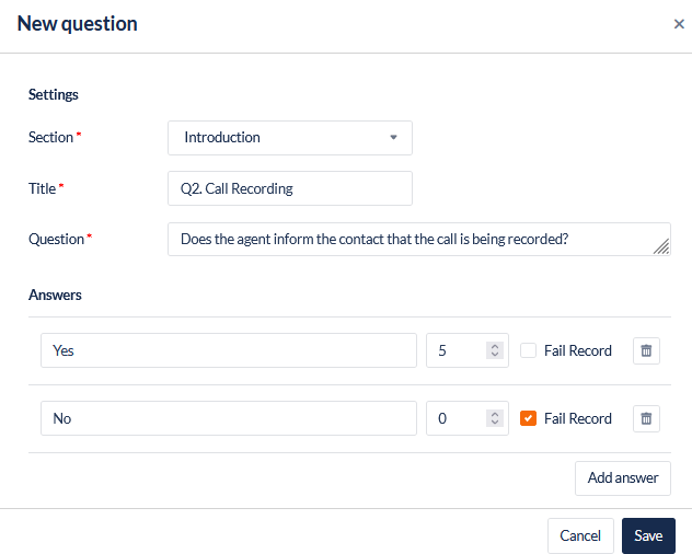 Question | Enter the text of the question, e.g. "Does the agent notify the contact that the call is being recorded?" |