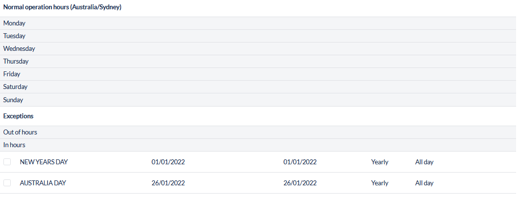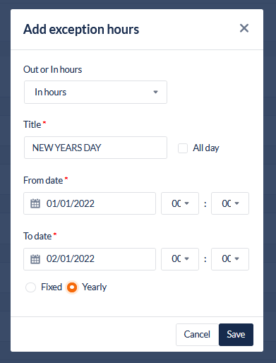 Add or Edit Exceptions (Out of hours) and Exceptions (In hours):