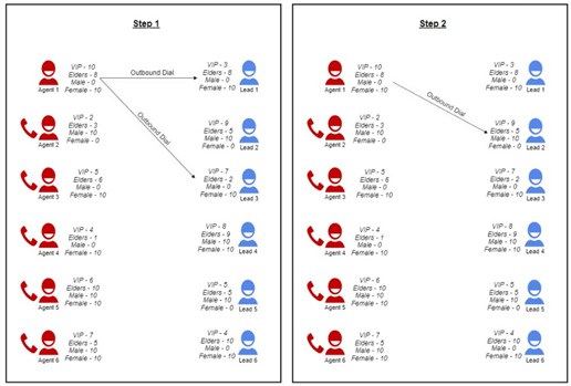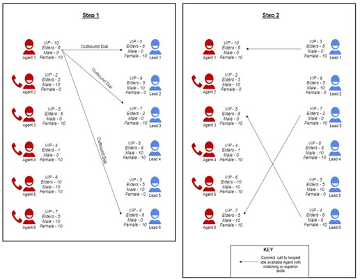 For examples of how Skills-Based Dialling behaves in a Predictive Outbound setting (with dialler ratio set 1:3), please see below diagrams: