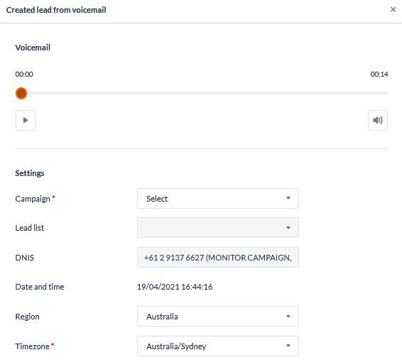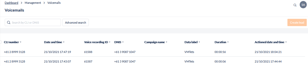 The Voicemails module allows a user to manage voicemail recordings, and create and manage leads arising from them.