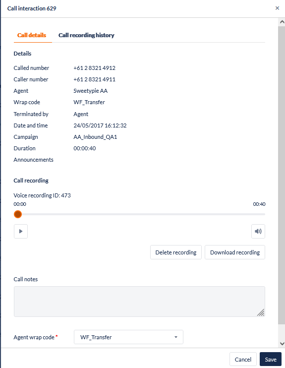 Where a sound recording exists for the interaction, click on the call from the list to open the Call Interaction dialog in which you can listen to the recording, view call details and notes