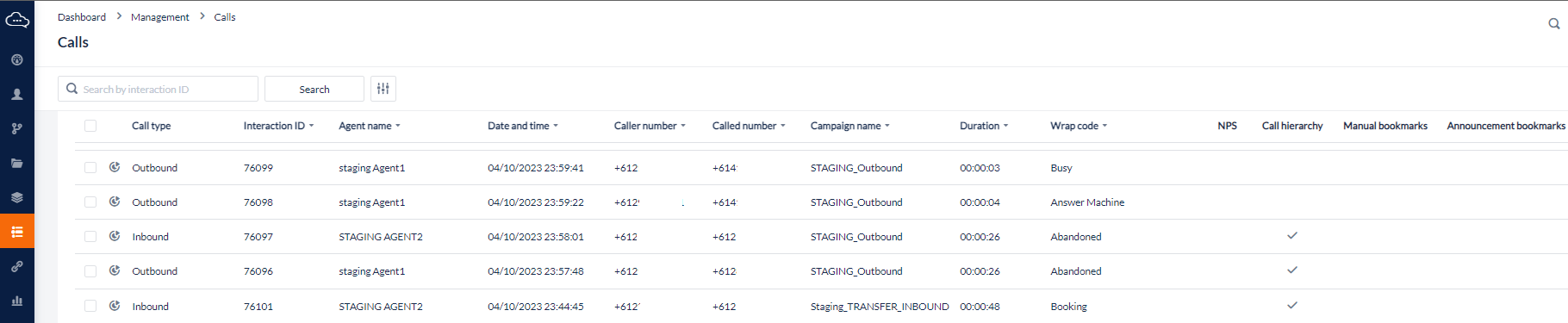 Caller Number | The source number for the call. For Outbound calls this displays Campaign or Organisational CLI, and for Inbound calls this displays the number of the caller if available. |