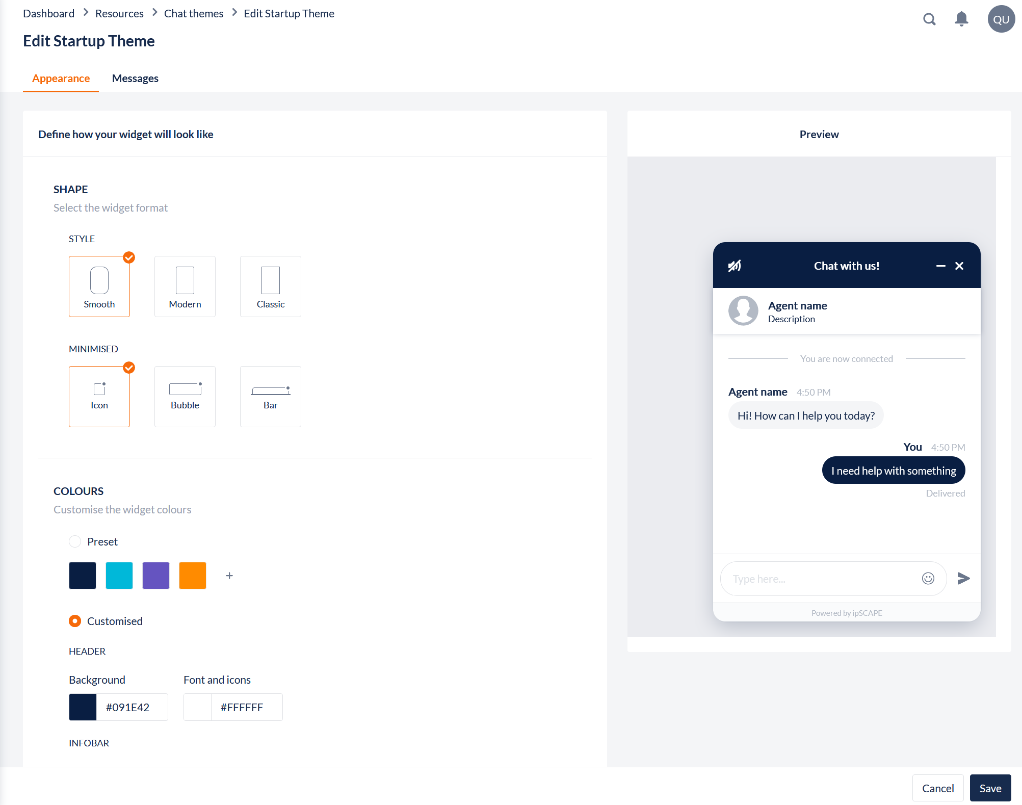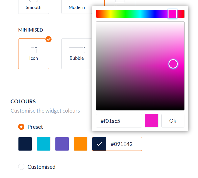 Options are available to customise the colours of the chat widget to match your website and/or organisation branding. The user has the option to select a Pre-set colour theme, or can created a Customised colour theme: