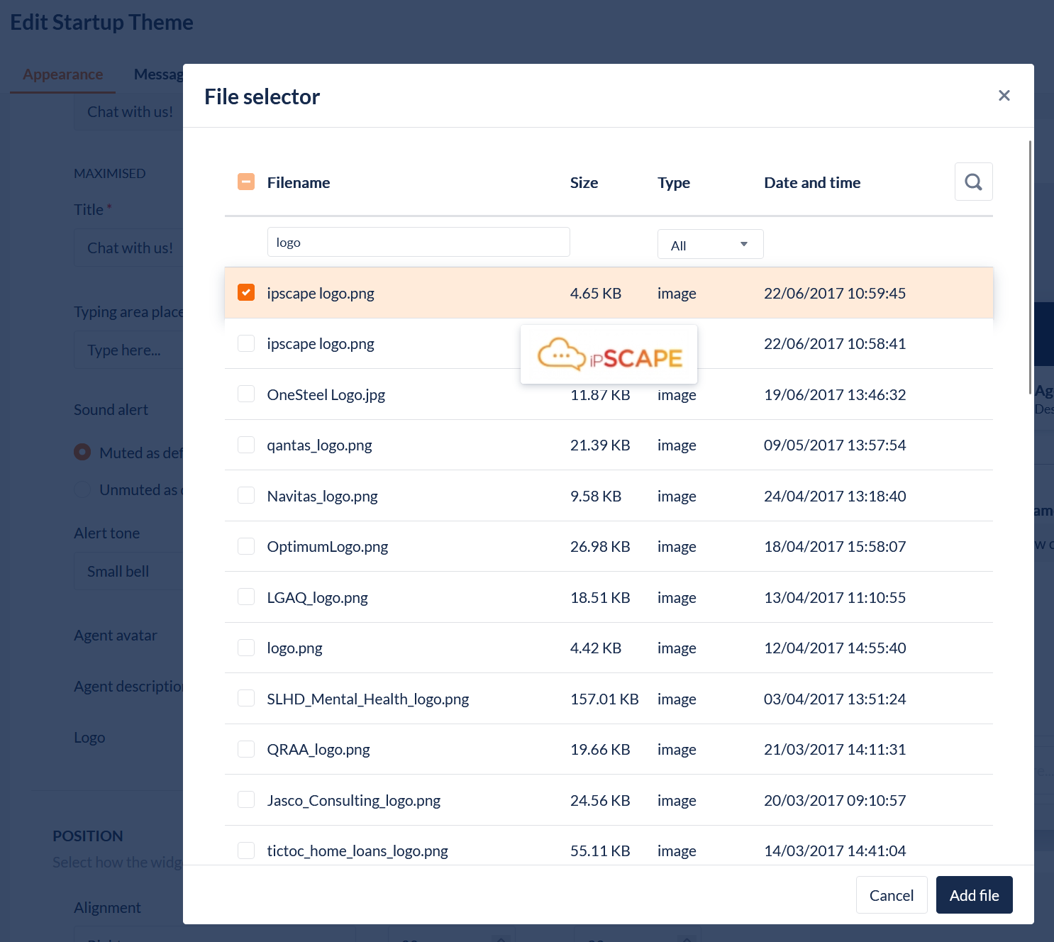 Logo | If a logo is required, click the toggle to enable to show the Select file icon. Click to open the File selector displaying image files loaded into the Workspace or the option to upload a file from the user device. To preview a image in the list, hover over the name of the file. To search for a file, click the icon in the top-right to open the search bar to search a file name. ![]() |