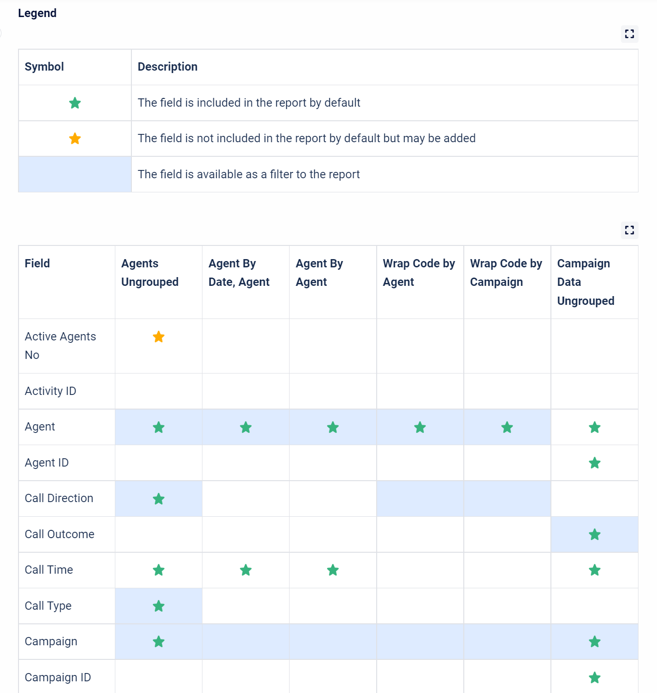 Every database field available to reporting is included in one or more datasets, which are groups of information available from the records of the contact centre.