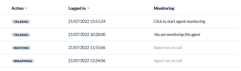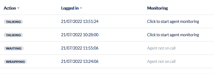 Monitoring | If the Agent is currently on a call, an option to initiate call monitoring is displayed |